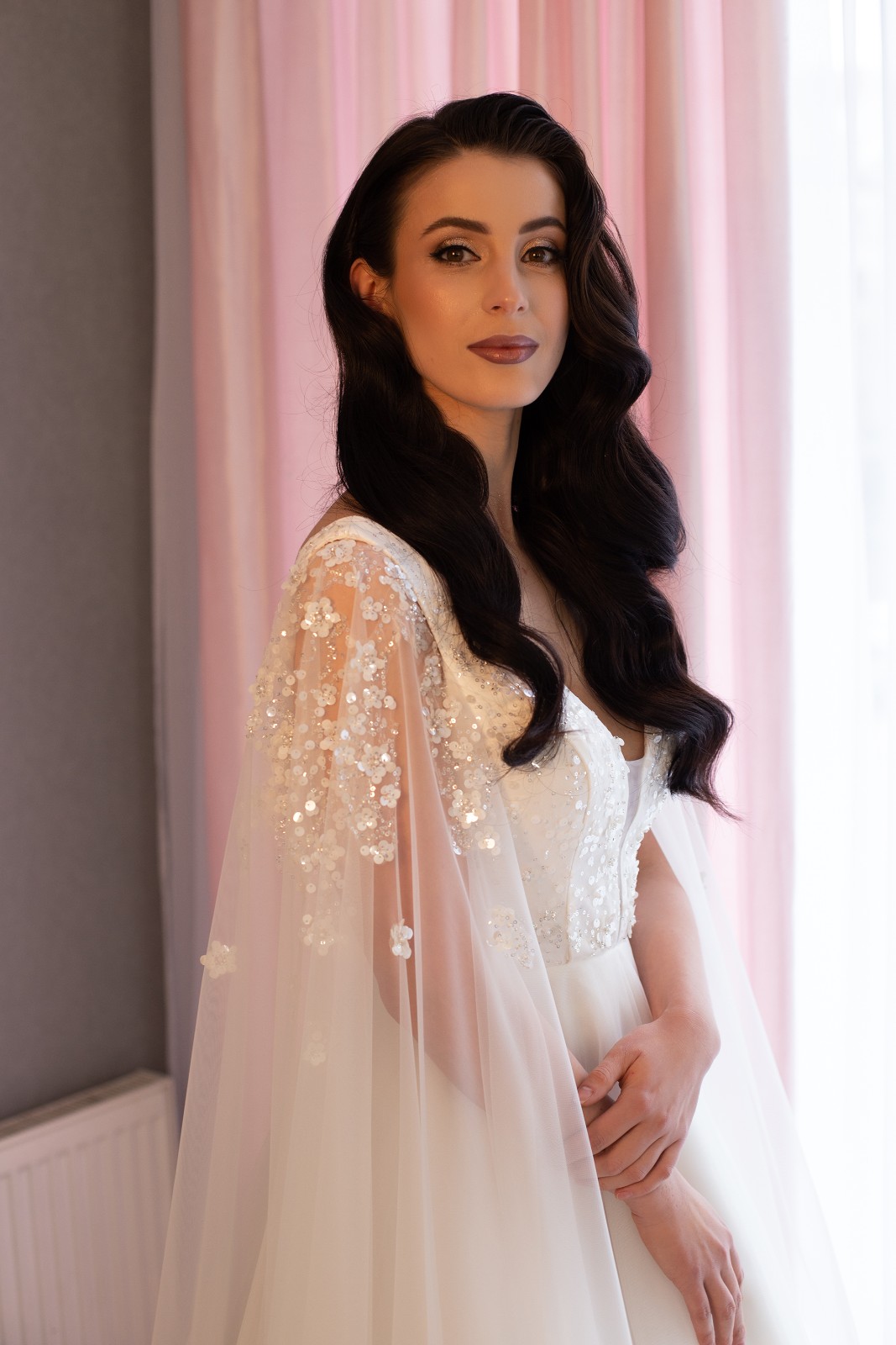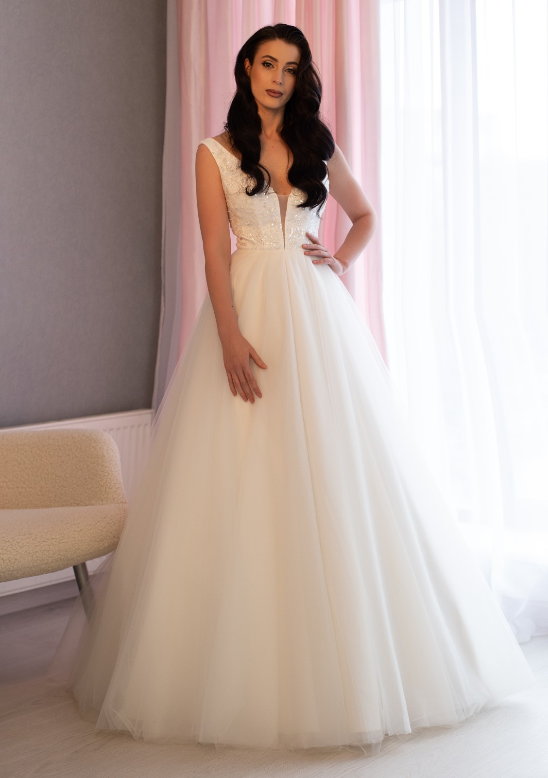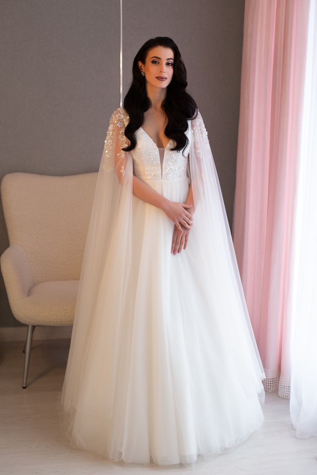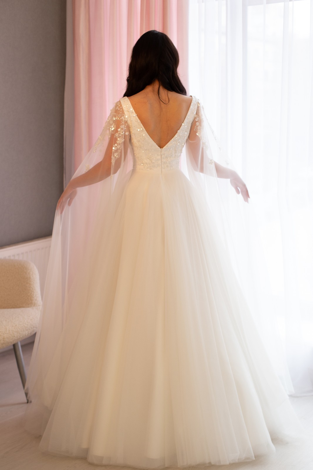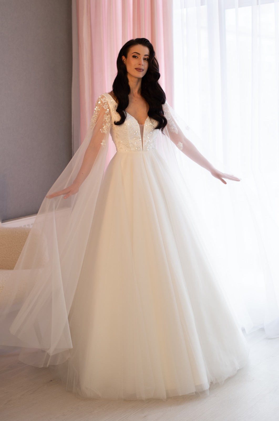 Весільна сукня з найніжнішого тюлю, з глибоким вирізом спереду, прикрашена розшитим мереживом по ліфу та знімним рукавам, р.42